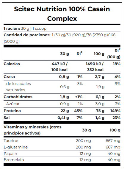 100 % Casein Complex es una mezcla de proteínas lácteas con caseína micelar predominante, exclusivamente a partir de proteínas lácteas de la