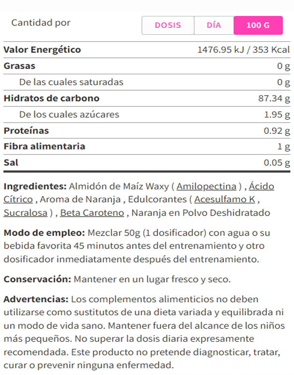 Producto compuesto por un complejo de carbohidratos de rápida acción, a base de almidón de maíz ceroso. El maíz ceroso es un tipo de maíz que se caracteriza por poseer un alto contenido en amilopectina (98-99%), un tipo de carbohidrato que aporta energía de manera rápida.