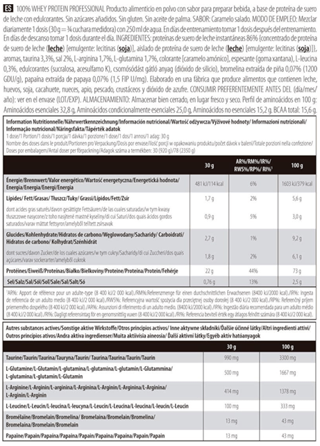 La proteína de suero lácteo que contiene 100% Whey Protein* Professional contribuye a aumentar y mantener la masa muscular y a conservar un sistema óseo normal**. Lo que son los ladrillos en las obras, son las proteínas para nosotros. Este producto incorpora también aminoácidos añadidos leucina, glutamina, arginina y taurina–, además de los aminoácidos que componen las proteínas. Finalmente, incorpora enzimas que apoyan la degradación de las proteínas, como la papaína y la bromelaína. Además, 100% Whey Protein Professional no contiene gluten. Y, no en último lugar, puedes elegir entre una variedad impresionante de sabores, desde los tradicionales hasta los especiales.