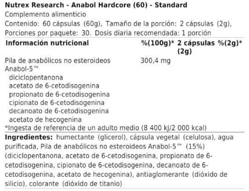 Anabol Hardcore de Nutrex es un complemento alimenticio que provee diciclopentanona, acetato de 6-cetodisogenina, propionato de 6-cetodisogenina, cipionato de 6-cetodisogenina, decanoato de 6-cetodisogenina y acetato de hecogenina. Viene en cápsulas líquidas que se asimilan rápidamente en el organismo.