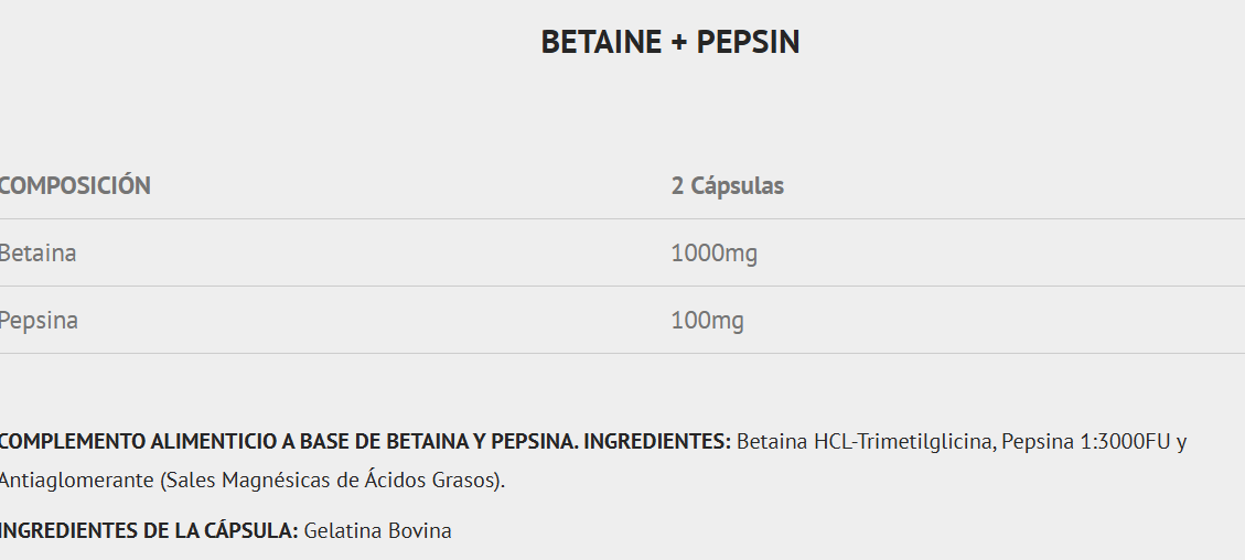 Este complemento alimenticio a base de Betaína y Pepsina une en su fórmula un compuesto esencial para la absorción de nutrientes y una potente enzima responsable de descomponer las proteínas y facilitar el correcto funcionamiento de la digestión. La betaína se encuentra en la naturaleza en alimentos como la remolacha, el trigo, las espinacas o los moluscos. Este derivado del aminoácido glicina también puede ser sintetizado por nuestro organismo a través de otro nutriente esencial, la colina.
