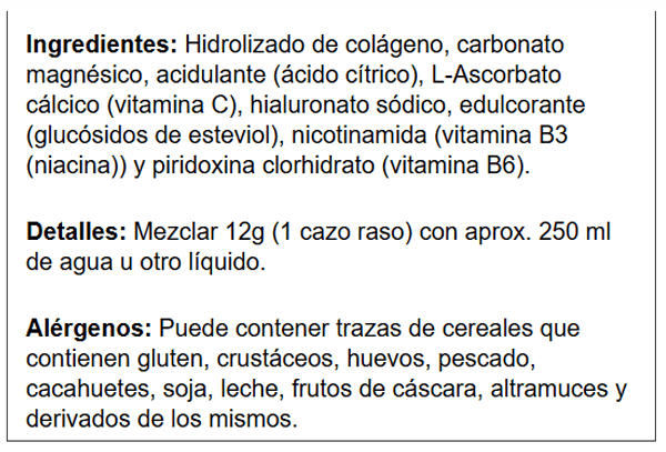 Colágeno Peptan® 100% hidrolizado de procedencia bovina de la más alta calidad y pureza, al contar con materia prima patentada. Por si fuera poco, junto a este ingrediente estrella encontramos ácido hialurónico para reforzar la acción del colágeno, magnesio y complejo vitamínico formado por vitamina C, B3 y B6.