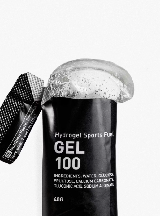 Gel 100 se ha desarrollado aprovechando la tecnología de hidrogel natural y está elaborado con seis ingredientes naturales. No contiene colorantes ni conservantes y viene en raciones de 40 g. Cada ración contiene un 60 % de carbohidratos, lo que representa una elevada relación peso-energía.