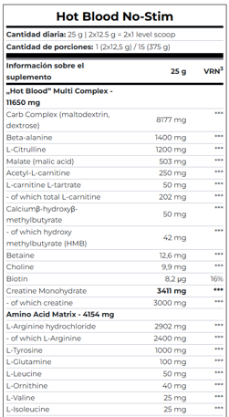 Hot Blood No-Stim apoya tu cuerpo durante los entrenamientos físicamente exigentes o de alta intensidad, ya que está científicamente probado que los 3 g de creatina en el producto aumentan el rendimiento durante secuencias de esfuerzos de corta duración y alta intensidad, como entrenamiento con pesas o cardio a intervalos.*