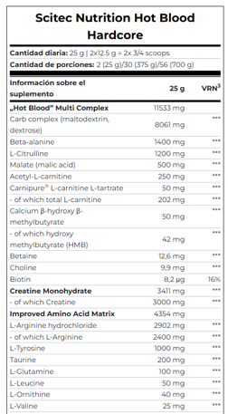 La creatina de HOT BLOOD HARDCORE mejora el rendimiento físico durante breves periodos de ejercicio de alta intensidad. El efecto beneficioso se consigue con una ingesta diaria de 3 g de creatina.