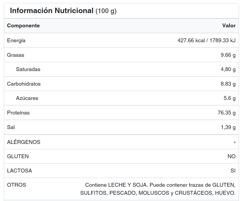 Alérgenos: Contiene LECHE Y SOJA. Puede contener trazas de GLUTEN, SULFITOS, PESCADO, MOLUSCOS y CRUSTÁCEOS, HUEVO. Fabricado en una planta que utiliza materias primas que presentan estos alérgenos pero que minimiza los riesgos de contaminaciones cruzadas.