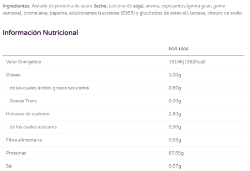 Fórmula complementada con una matriz de enzimas digestivas, Bromelina y Papaina como enzimas proteolíticas para mejorar la digestión y asimilación de la proteína, y lactasa para mejorar la digestión de la lactosa, convirtiéndose así en la proteína de mejor digestión y asimilación del mercado.