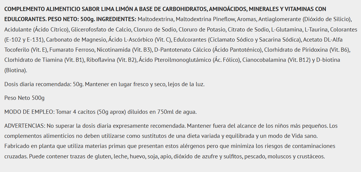 Este suplemento intra entreno está formulado fundamentalmente con maltodextrina, un hidrato de carbono que se obtiene de la hidrólisis del almidón y que presenta una rápida asimilación y una liberación sostenida. Esto ofrece una administración y aprovechamiento máximos de la energía, reduciendo al mínimo las molestias gastrointestinales.