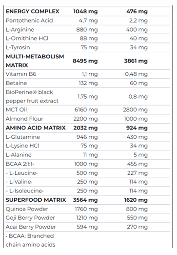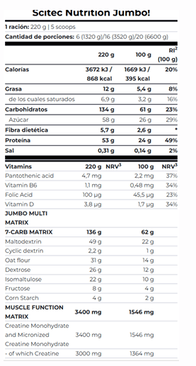 Jumbo, fiel a su nombre, ayuda a aquellos que buscan ganar volumen para lograr ese excedente de calorías más fácilmente. Contiene 135 g de carbohidratos y 53 g de proteína por dosis, esto hace que podamos aumentar la cantidad de macronutrientes consumidos en un día y por lo tanto la cantidad de calorías que ingerimos diariamente.