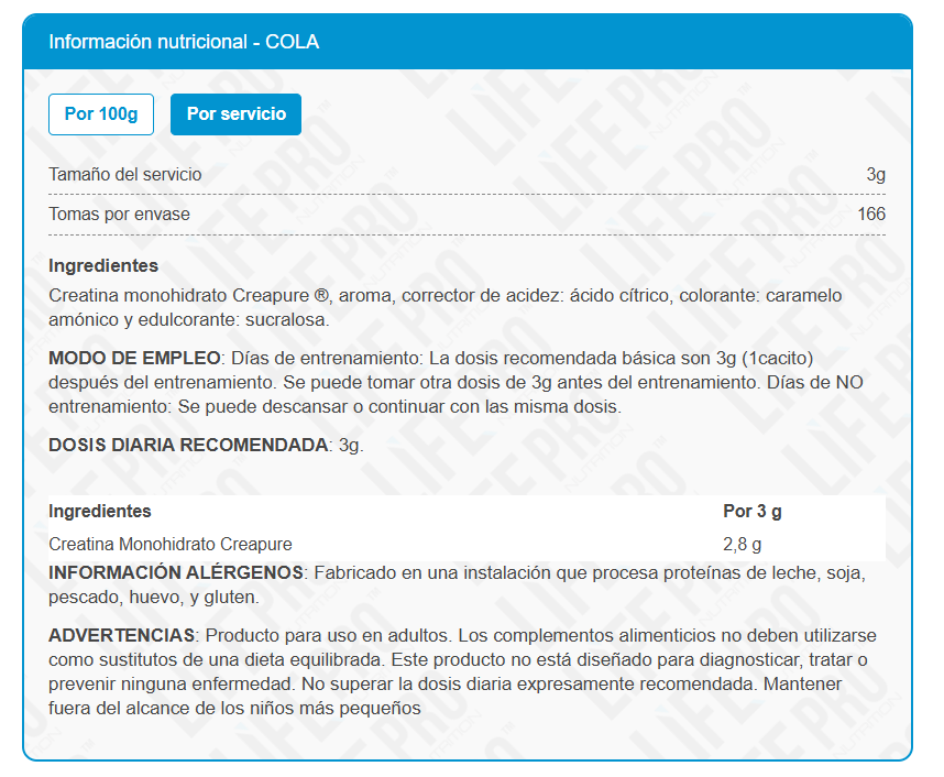 - Cuenta con el sello GMO que asegura que el producto Creapure de Life Pro ha sido elaborado bajo las normas de buena fabricación.