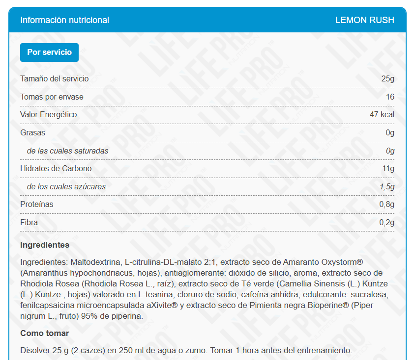 Life Pro Wild Pump ha sido edulcorado en sus 3 sabores con sucralosa. No contiene aspartamo ni otro tipo de edulcorantes, . Es un edulcorante apto para diabéticos debido a que no influye en la glucemia o concentración de azúcar en sangre.