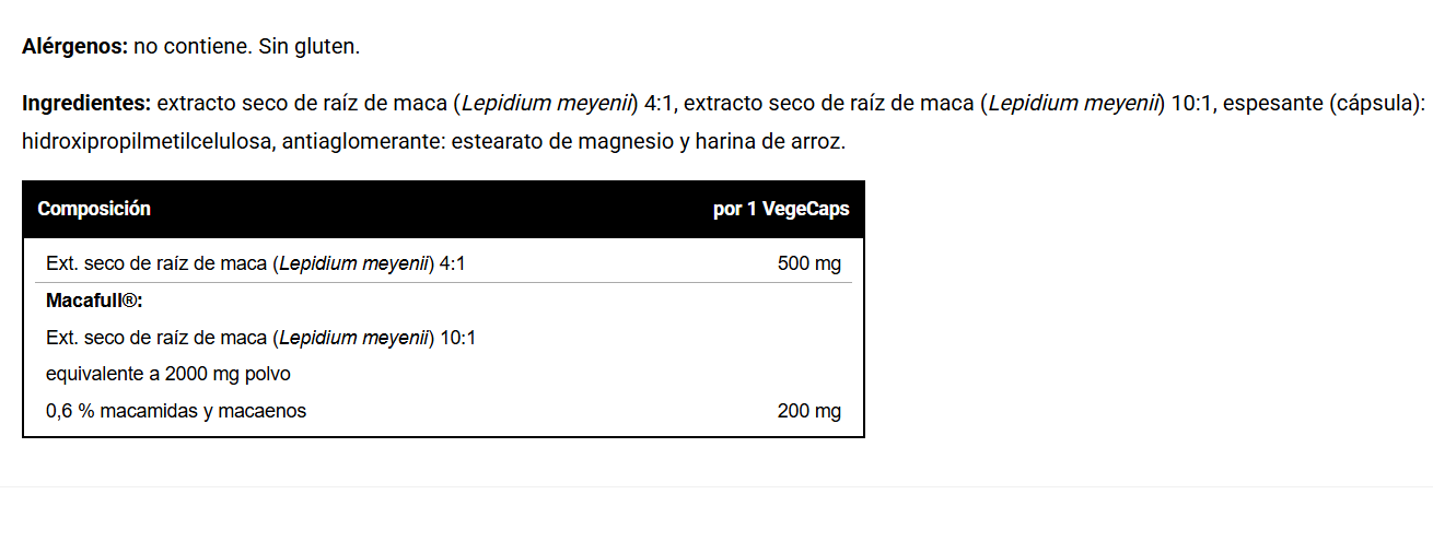 Para la elaboración de su Maca Andina 2500Vitobest® utiliza Macafull®, un extracto seco de Lepidium meyenii estandarizado al 0,6 % (macamidas y macaenos), posiblemente la concentración más elevada del mercado, con un ratio 10:1 equivalente a 2000 mg de la planta en polvo.