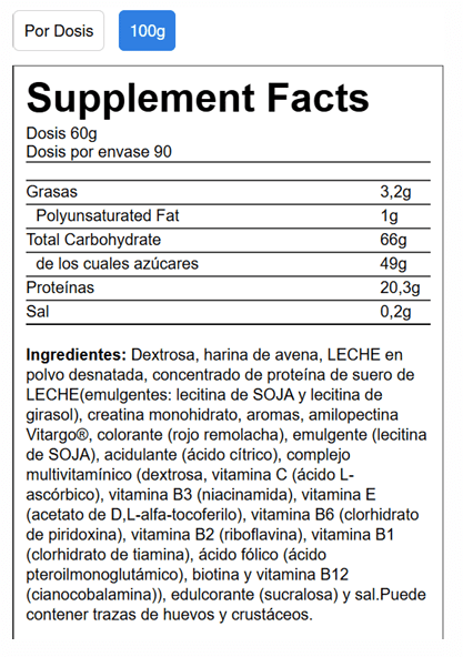 El alto contenido del carbohidrato patentado VITARGO permitirá un aporte energético prolongado en el tiempo, lo que nos permitirá conseguir un alto rendimiento en todo momento y una mejor recuperación de glucógeno tras el entrenamiento. Contiene una importante concentración de proteína de suero con proceso CFM, materia prima de la mejor calidad para asegurar una construcción muscular sólida, que se verá potenciada con el aporte de creatina que contiene. Esto no solo mejorará la construcción de masa muscular, sino que además será una fuente extra de energético y conseguirás un efecto voluminizador inmediato.