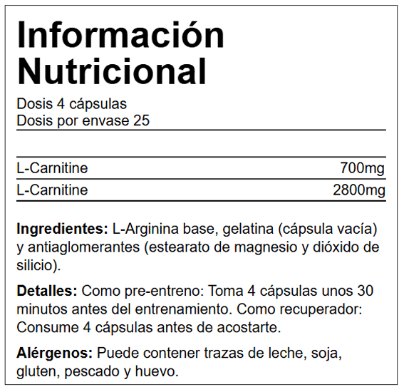 Complemento alimenticio elaborado a base de L-arginina libre. La L-arginina es un aminoácido que actúa como precursor del óxido nítrico, sustancia que promueve la vasodilatación y por ello ayuda a retrasar la aparición de fatiga durante la actividad física.