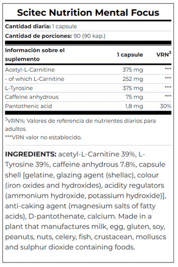 La cápsula Mental Focus contiene cuatro principios activos: cafeína, ácido pantoténico, L-carnitina y L-tirosina. La cafeína es una sustancia muy conocida por su efecto estimulante en la vida cotidiana, que ayuda a mejorar la concentración y aumentar el estado de alerta. Además del efecto de la cafeína, contiene ácido pantoténico, también conocido como vitamina B5, que contribuye al rendimiento mental normal y contribuye a reducir el cansancio y la fatiga. El producto también contiene un derivado de aminoácido, la L-carnitina, así como el aminoácido L-tirosina, que nuestro organismo sintetiza de forma natural.
