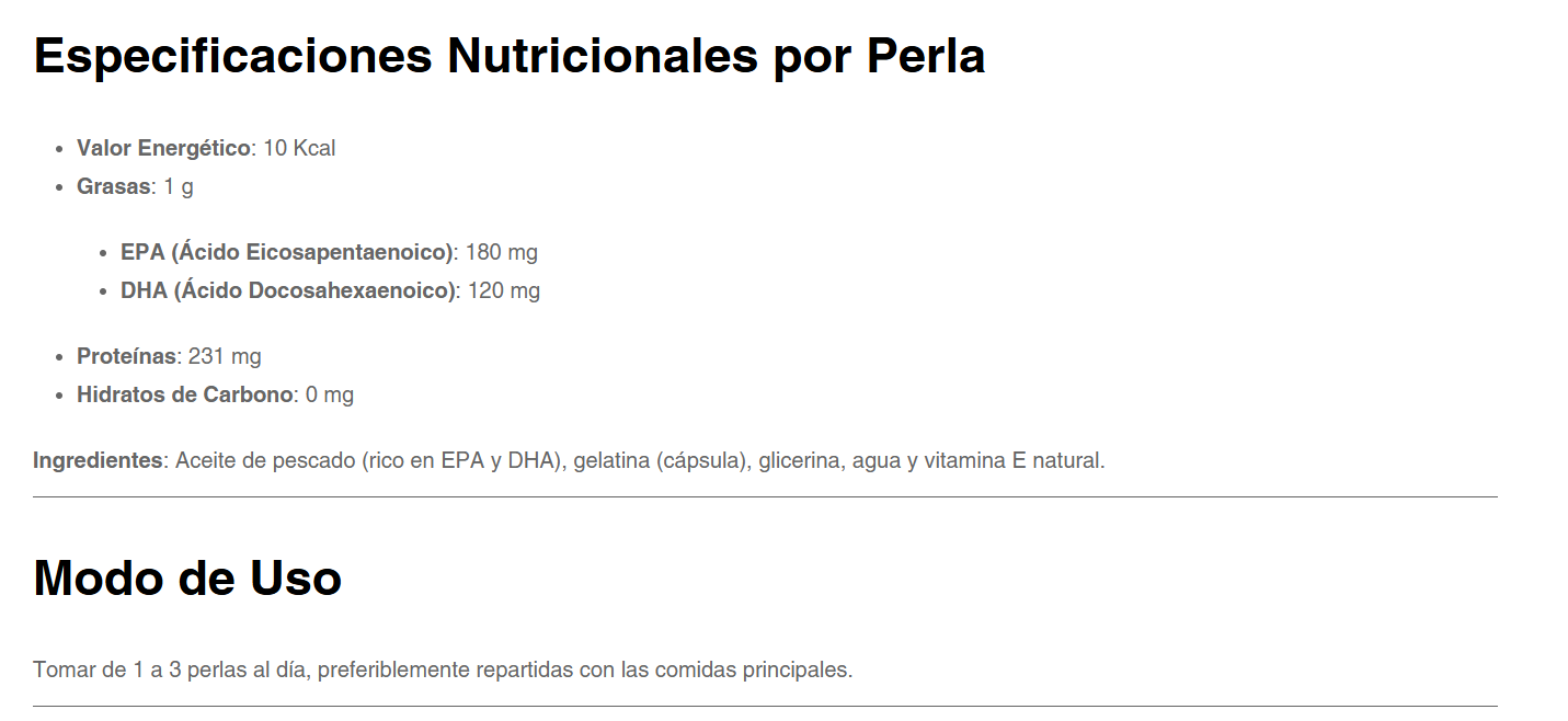 - 1.000 mg de aceite de pescado por perla: Alta concentración en Omega 3, con 180 mg de EPA y 120 mg de DHA por perla.