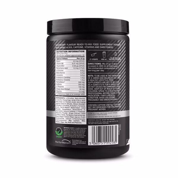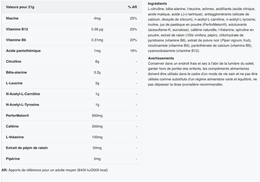 Este pre-entreno contiene 500mg de Performelon, que proviene de la sandía y contiene L-citrulina, que aumenta la cantidad de oxígeno que llega a los músculos, mejorando tu resistencia y potencia muscular.