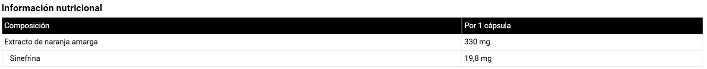 Complemento alimenticio a base de plantas. Peso neto: 58 g. Presentación: 100 cápsulas. Dosis diaria recomendada: 1 cápsula. Modo de empleo: Tomar 1 cápsula al día con un vaso de agua. Ingredientes: Extracto seco de naranjo amargo (Citrus aurantium L., 6% p sinefrina), cápsula (gelatina), agente de carga (celulosa) y antiaglomerante (sales magnésicas de ácidos grasos). Puede contener trazas de gluten (trigo y avena), frutos de cáscara, cacahuete, huevos, leche, pescado y soja. Un producto a base de P-sinefrina obtenida de forma natural del fruto de la naranja amarga (Citrus aurantium L) perfecto para ofrecer todo de ti mismo durante los entrenamientos más exigentes PURE synephrine es un estimulante del sistema nervioso central, tratándose de un suplemento ideal para todos los deportistas que quieran llevar a cabo los entrenamientos más duros en: