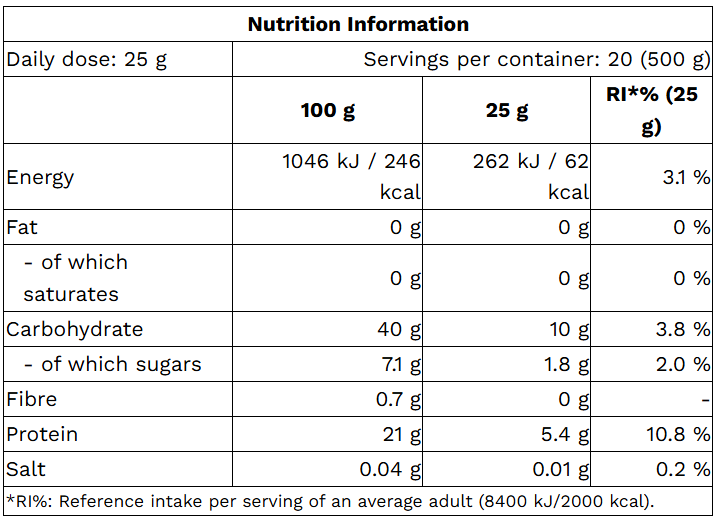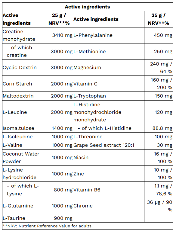 *: La creatina aumenta el rendimiento físico durante ejercicios cortos, repetitivos y de alta intensidad – El cromo contribuye al mantenimiento de niveles normales de azúcar en sangre – Magnesio, vitamina B6, niacina y vitamina C participan en los procesos metabólicos normales productores de energía – Magnesio, vitamina B6, niacina y vitamina C contribuyen a la reducción de la fatiga y el cansancio.
