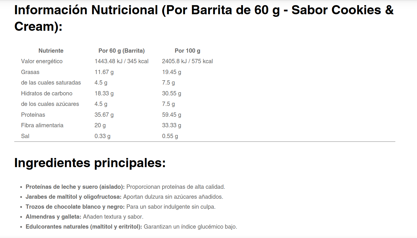 - Alta en proteínas: 21 % de proteína por barrita (procedente de aislado de suero y proteína de leche).
